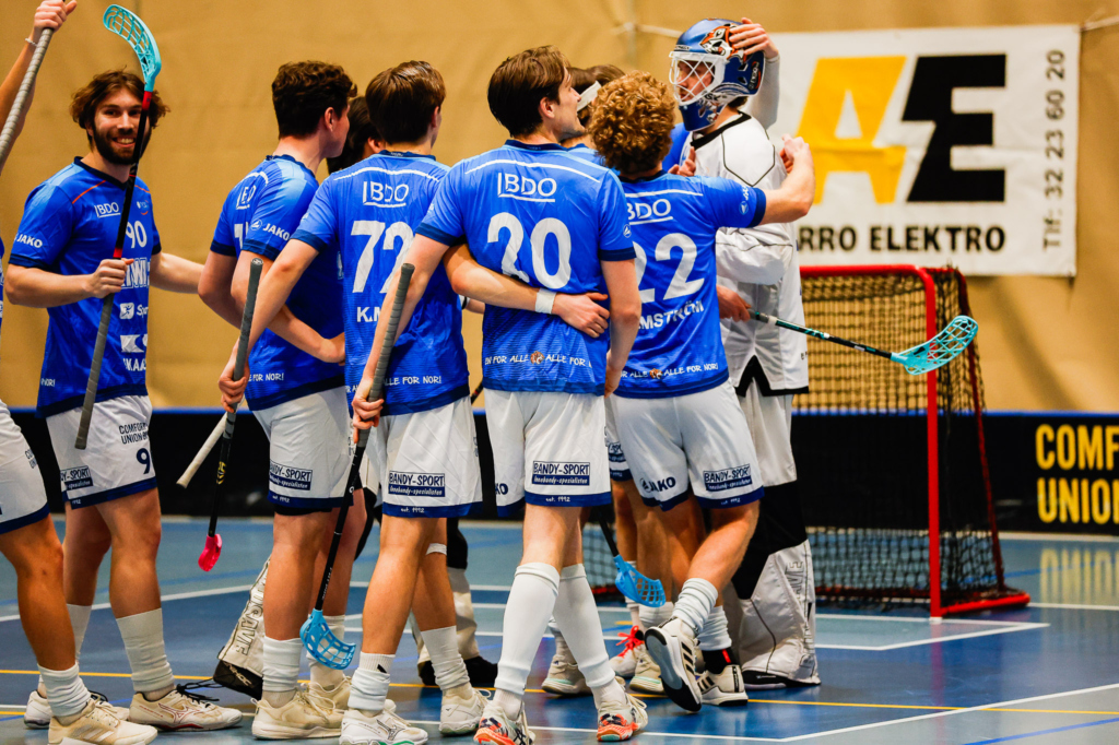 Kunne juble til slutt! Gutta avgjorde kampen med kun 9 sekunder igjen og leder kvartinale serien 1-0 i kamper (Foto: Innebandyavisen.no)